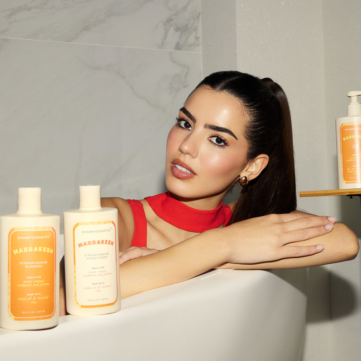 Work into wet hair, focusing on the roots, and let the strengthening formula cleanse and nourish. Rinse thoroughly and follow with SHAMPOOHOTEL™ Marrakesh strengthening conditioner.